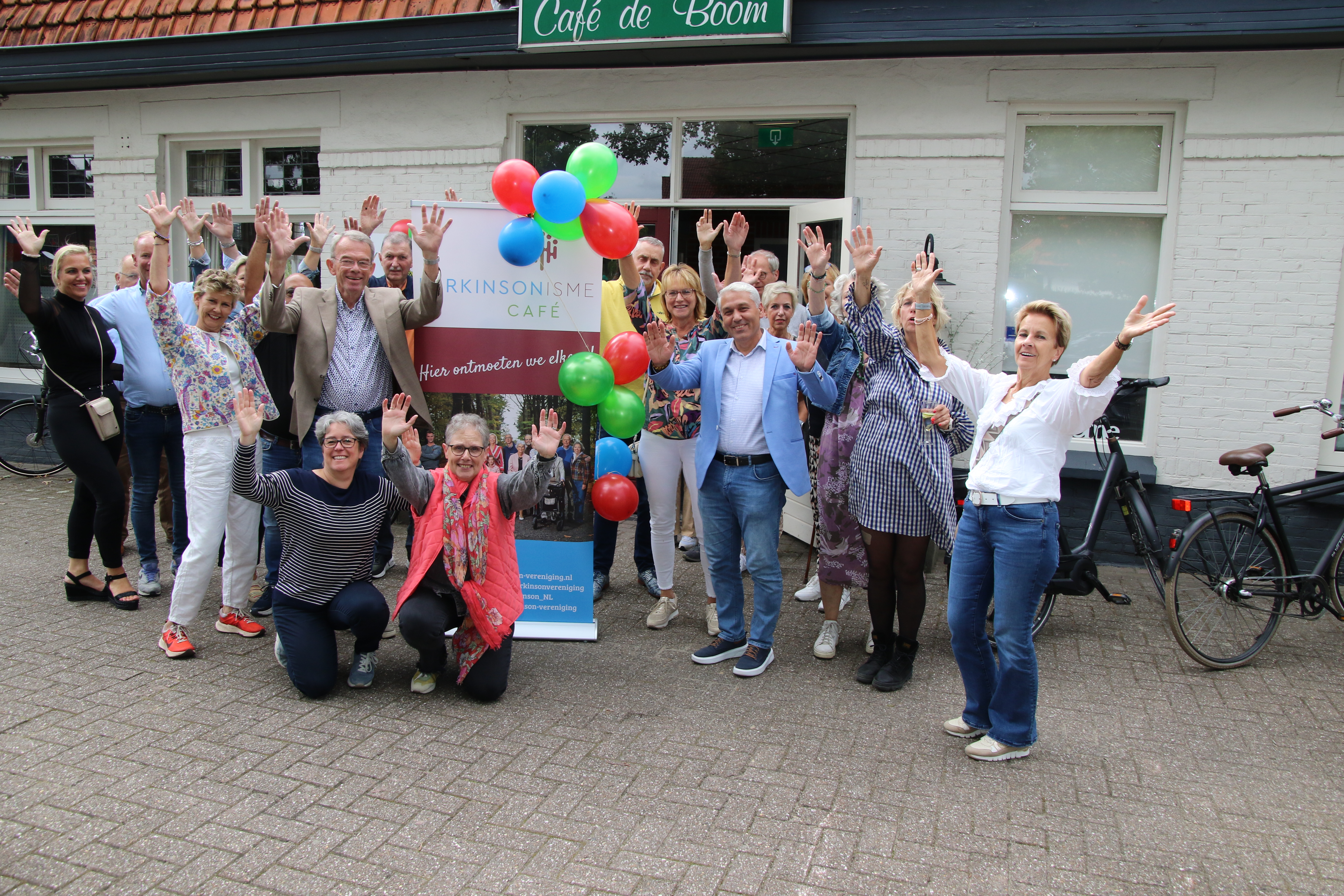 “Het is eindelijk zover: we zetten de stap en gaan verder onder de vlag van de Parkinson Vereniging. De banner, versierd met rode, gele en blauwe ballonnen (kleuren in het logo van de Parkinson Vereniging) staat klaar. Net zoals de welkomstdrankjes in feestelijke glazen, versierd met een mooi schijfje citroen of sinaasappel. Ook de koffie en thee staan klaar en een prachtige taart met het logo van de Parkinson Vereniging. (wat zijn we blij met Virgenie in ons midden).