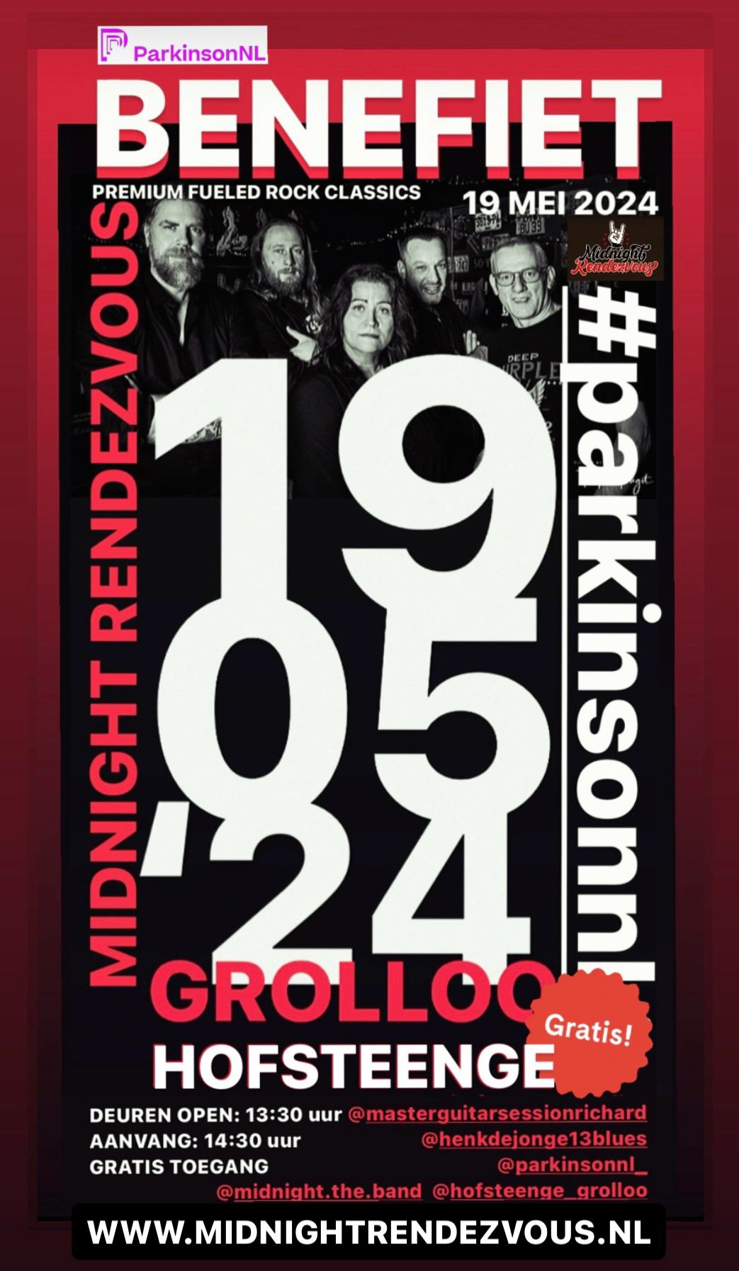 zondag 19 mei 2024 13:30 19 mei wordt er een benefietconcert georganiseerd door Midnight Rendezvous voor ParkinsonNL.