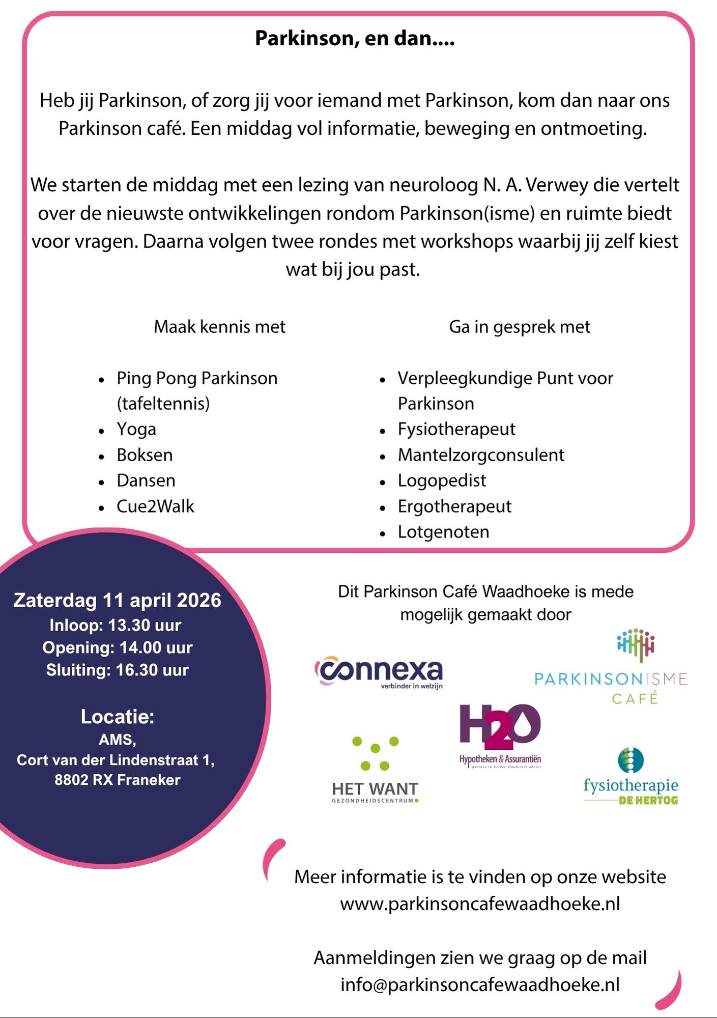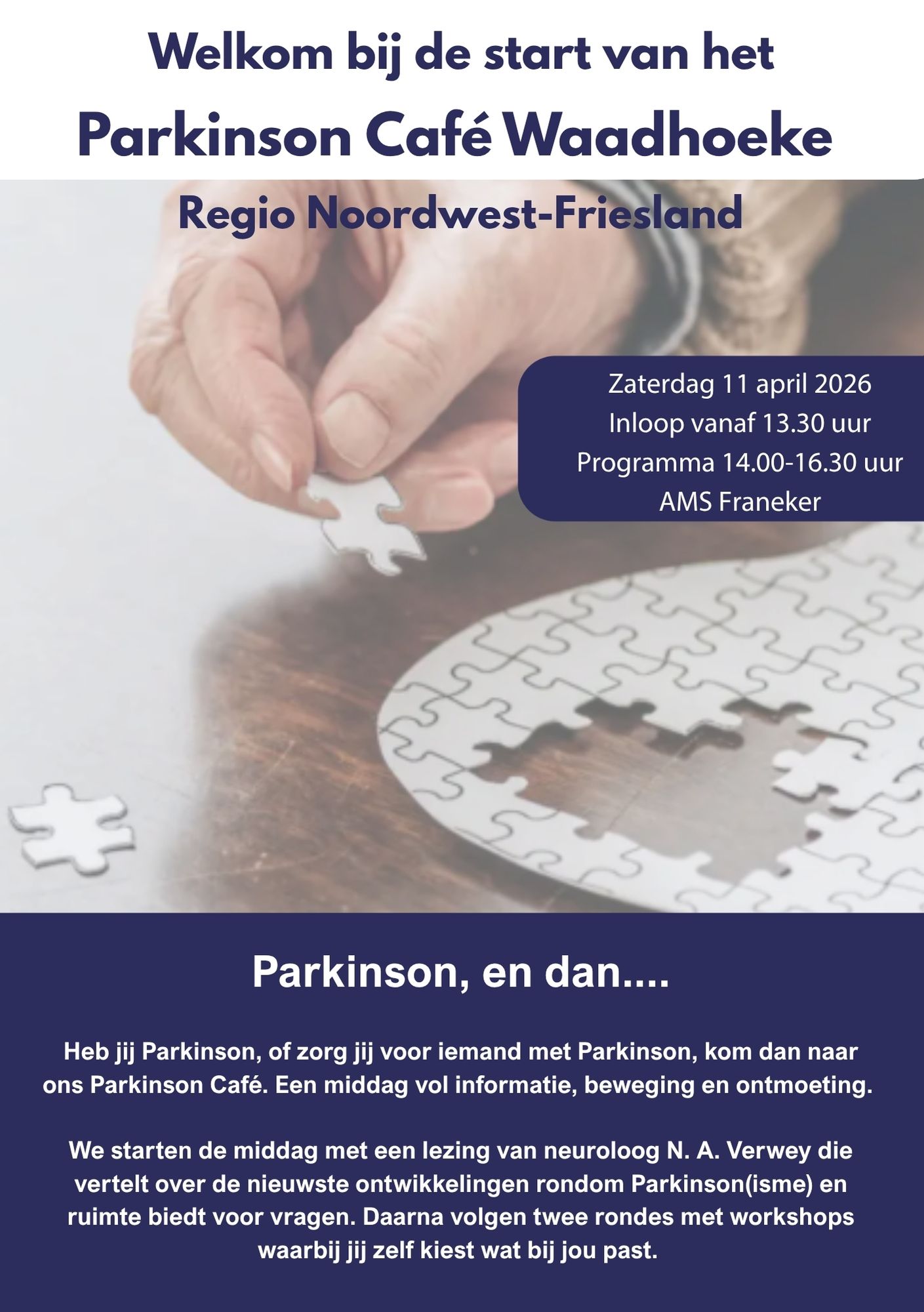 Op zaterdag 11 april 2026 bent u welkom bij de start van het Parkinson Café Waadhoeke.