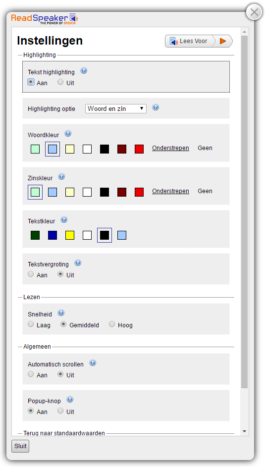 - Kiezen voor tekstmarkering op woord- en zinsniveau, of alleen per zin, of alleen per woord